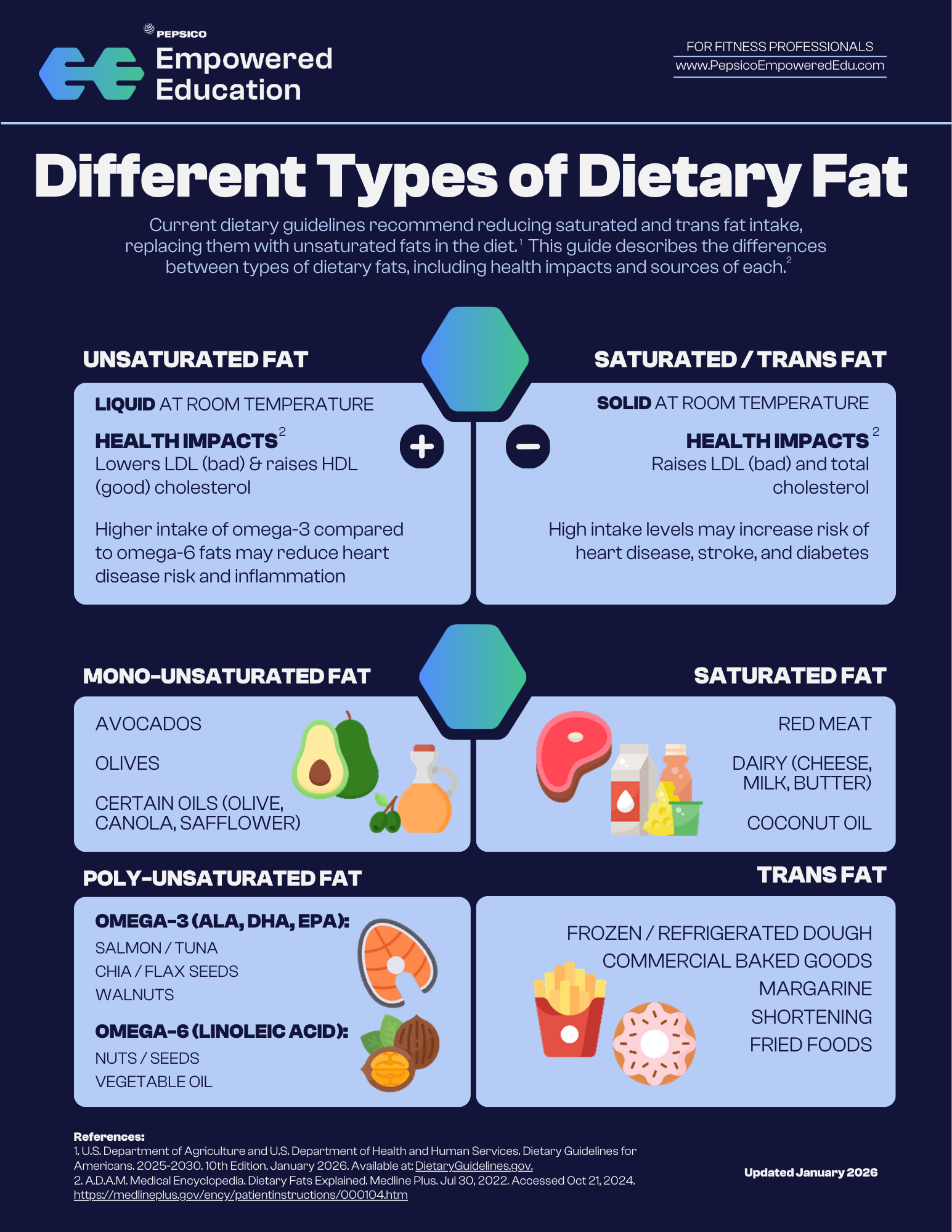 What are you interested in? Nutrition Basics Dietary Habits Modern Mealtime Ingredients Claims & Labels Science Communication Filter Resources By keyword Budget nutritionCarbohydratesCredible nutrition sourcesDiet trendsDietary GuidelinesDigestive healthEnergy balanceFatFiberFood additivesFood labelsFood processingGenetically modified organisms (GMOs)Gluten-freeGut healthHealthy eatingHydrationIntermittent fastingLow-calorie sweetenersLow-carb / ketoMacronutrientsManaging misinformationMicronutrientsMineralsNutrition myths & factsNutrition researchNutrition tipsOrganicPaleoPlant-basedProbiotics & PrebioticsProduct ClaimsProteinResearch evaluationScience communicationSnackingSugarSustainabilityVitaminsWeight managementWhole grains By content type GraphicInfographicPodcastPresentationQuick SlidesRecipeVideoWebinar Reset Showing results for: 71 - 80 of 84 results Trending Diet Hot Sheet – Intermittent Fasting Key Topics Covered Description, purpose, and food rules of the various types. Scientific evidence for perceived health benefits overall and by type.Important nutrition considerations. View Graphic Functions & Benefits of Dietary Fat Key Topics Covered Dietary fats roles & functions.Why dietary fats are an essential macronutrient. View Graphic What Is a Plant-Based Eating Pattern Key Topics Covered Description of plant-based eating patterns and the various types.Scientific evidence for the perceived health benefits of various plant-based diets.Important nutrition considerations when following a plant-based diet. View Infographic Trending Diet Hot Sheet – Paleo Key Topics Covered Description, purpose, and food rules.Scientific evidence for perceived health benefits.Important nutrition considerations. View Graphic Trending Diet Hot Sheet - Gluten Free Key Topics Covered Description, purpose, and food rules.Scientific evidence for perceived health benefits.Important nutrition considerations. View Graphic Vitamins & Minerals – Functions & Sources Key Topics Covered Identification of specific vitamins and minerals that play a role in various critical functions in the body.Common food sources that provide the vitamins & minerals to support each function. View Infographic Different Types of Dietary Fat Key Topics Covered Descriptions, health impacts, and food sources of various types of dietary fats.Comparison of key attributes between unsaturated, saturated, & trans fats. View Infographic Trending Diet Hot Sheet - Low-Carb / Keto Key Topics Covered Description, purpose, and food rules.Scientific evidence for perceived health benefits.Important nutrition considerations. View Graphic Vitamins vs. Minerals Key Topics Covered Identification of different types or subgroups of vitamins and minerals.Description of characteristics and functions of vitamins, minerals, and the subgroups of each.Key similarities and differences between vitamins and minerals (and the different subgroups of each). View Infographic Using Insights to Hype Up Hydration Key Topics Covered Common hydration trends.Simple ways to increase fluid intake. View Infographic Show More