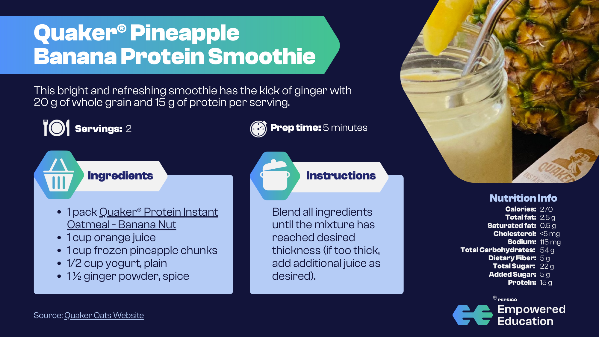 What are you interested in? Nutrition Basics Dietary Habits Modern Mealtime Ingredients Claims & Labels Science Communication Filter Resources By keyword Budget nutritionCarbohydratesCredible nutrition sourcesDiet trendsDietary GuidelinesDigestive healthEnergy balanceFatFiberFood additivesFood labelsFood processingGenetically modified organisms (GMOs)Gluten-freeGut healthHealthy eatingHydrationIntermittent fastingLow-calorie sweetenersLow-carb / ketoMacronutrientsManaging misinformationMicronutrientsMineralsNutrition myths & factsNutrition researchNutrition tipsOrganicPaleoPlant-basedProbiotics & PrebioticsProduct ClaimsProteinResearch evaluationScience communicationSnackingSugarSustainabilityVitaminsWeight managementWhole grains By content type GraphicInfographicPodcastPresentationQuick SlidesRecipeVideoWebinar Reset Showing results for: 1 - 10 of 27 results Quaker® Pineapple Banana Protein Smoothie Key Topics Covered 15 g protein20 g whole grains5 g dietary fiber View Recipe Almond Butter Muffins Key Topics Covered Easy recipes20g Whole grains3g Fiber6g Plant-based Protein View Recipe Gluten-Free Blueberry Banana Muffins Key Topics Covered Easy recipes3 g dietary fiber100 calories View Recipe Vegetable Soup with Oats, White Beans, & Kale Key Topics Covered healthy recipesplant-basedhigh protein & fiber View Recipe Buffalo Cauliflower with Oat Flour Key Topics Covered easy recipeplant-basedappetizers View Recipe Pumpkin Cranberry Oatmeal Bars Key Topics Covered healthy recipeseasy snack optionswhole grains and dietary fiber View Recipe Cinnamon-Pumpkin Overnight Oats Key Topics Covered healthy recipewhole grains & dietary fiberproteinbreakfast View Recipe Ginger Cinnamon Oatmeal With Nut Butter Key Topics Covered healthy recipewhole grainsbreakfast View Recipe Mix It Up! A Quick Guide to DIY Trail Mix Key Topics Covered trail mix components & portionshealth benefits of trail mix ingredientsproportion guidance & mix examples View Infographic Honey Almond Granola Berry Yogurt Bark Key Topics Covered healthy recipequick recipefiberprotein View Recipe Show More